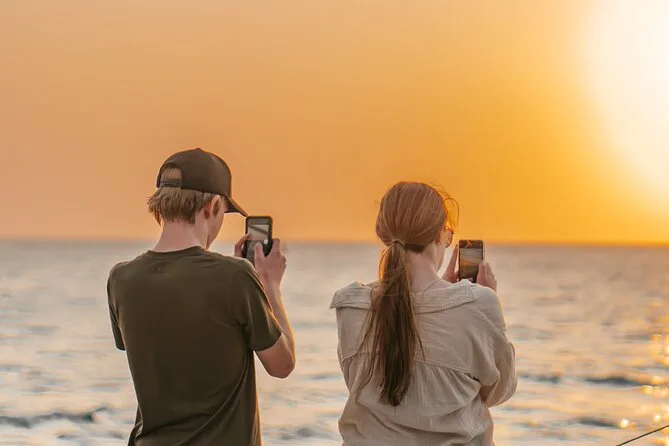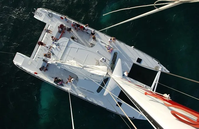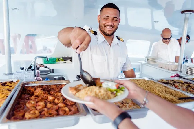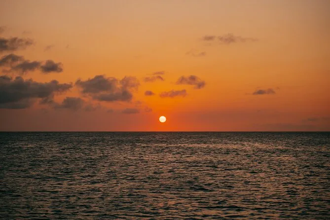You’ll board a catamaran right off Palm Beach for a relaxed sunset sail along Aruba’s coast—with an open bar flowing, live Caribbean music playing softly in the background, and a buffet dinner of local favorites like keshi yena and fresh grouper. It’s easygoing and warm—the kind of evening where you’ll probably laugh more than you expected.