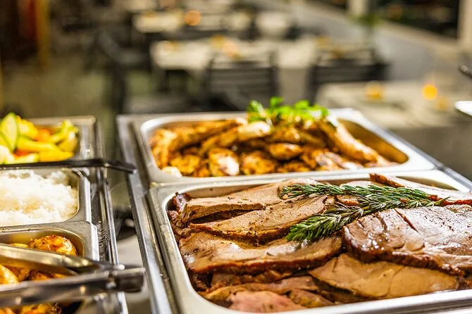 The chef-prepared buffet features hot and cold selections like ocean king prawns and grilled chicken tenderloins plus fruit platters and desserts.