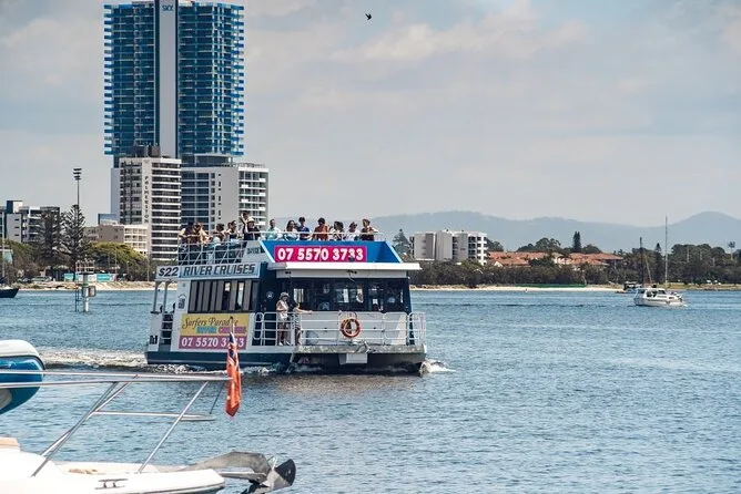 Your 1.5-hour day includes flexible departures from Surfers Paradise with engaging local commentary as you pass landmarks like Southport Yacht Club and Marina Mirage, plus morning tea or snacks depending on your selected time slot—afternoon cruises offer cheese and crackers while sunset trips add antipasto platters—and access to both indoor seating and an open sundeck alongside a fully licensed bar before returning to shore.