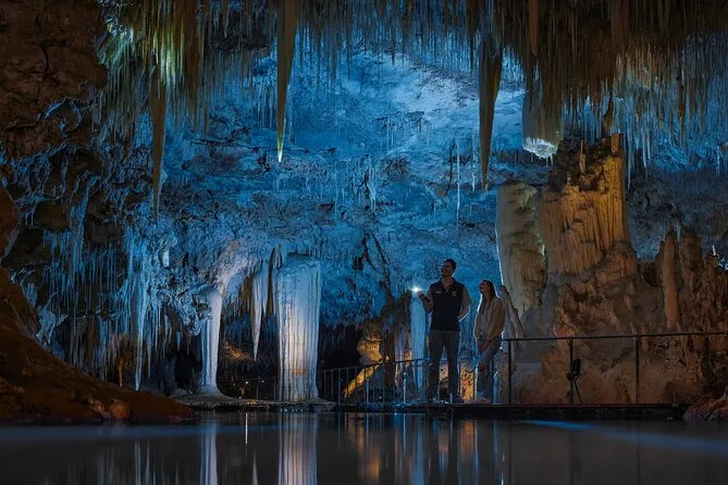 You’ll descend through a sunken karri forest into Lake Cave with a local guide, where crystal formations drip into a perfectly mirrored underground lake. Experience rare sights like the suspended table formation and pause in silence as lights reveal hidden details around you. Afterward, take in treetop views from the deck above — it leaves you feeling both tiny and lucky.