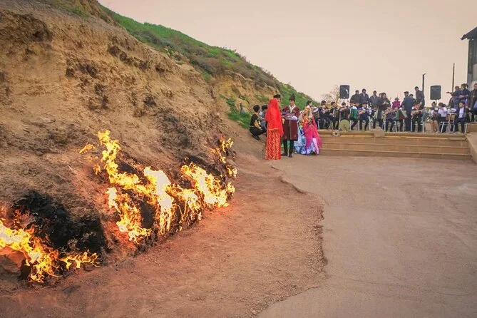 You’ll stand where ancient artists carved stories into stone at Gobustan, feel the odd warmth of mud volcanoes under your shoes, taste local snacks from roadside stalls, and watch eternal flames flicker at Yanar Dag and Ateshgah Fire Temple — all on a single day trip from Baku that leaves you thinking about time itself.