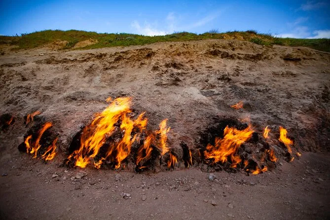 Lunch was at a small place near Baku Old City — lavash bread still warm from the oven, eggplant salad with pomegranate seeds. I tried saying “thank you” in Azerbaijani (Emin laughed at my accent). Then came the Fire Temple of Ateshgah: flames burning from stone altars, old Zoroastrian symbols carved everywhere. You could almost hear echoes of prayers layered over centuries. Last stop was Yanar Dag — fire literally coming out of the hillside. It’s strange how normal it seems to locals; kids were playing nearby like it was just another park.