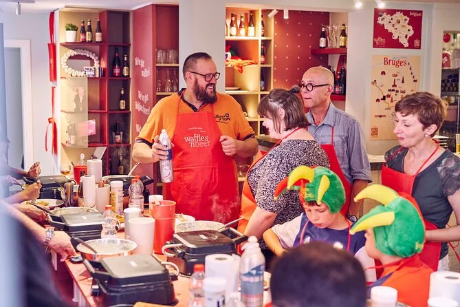 Your day includes a guided Belgian beer tasting session (with non-alcoholic options for kids), all ingredients for making your own waffles from scratch, unlimited access to toppings and freshly baked waffles, plus bottled water throughout — all right in Bruges city center before heading out full and happy.
