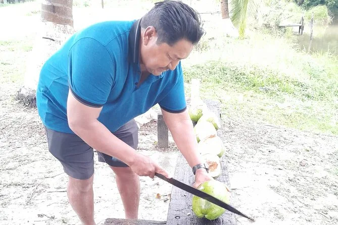 The full day trip lasts several hours including drive time, river cruise, temple exploration, lunch, and return transfer.