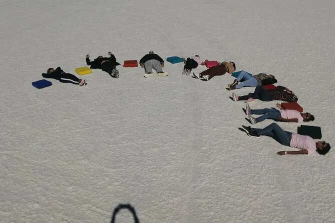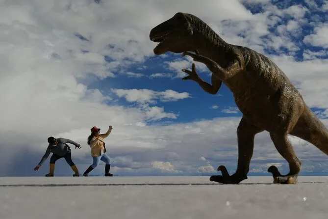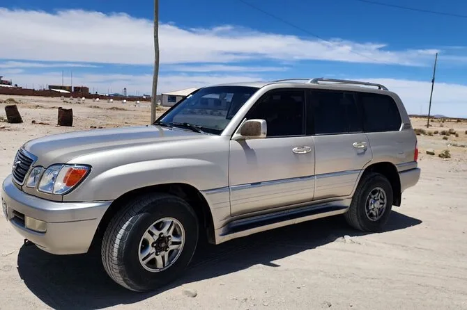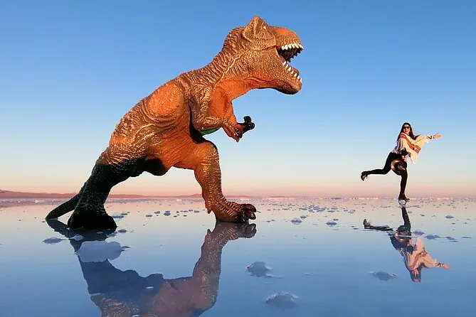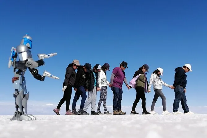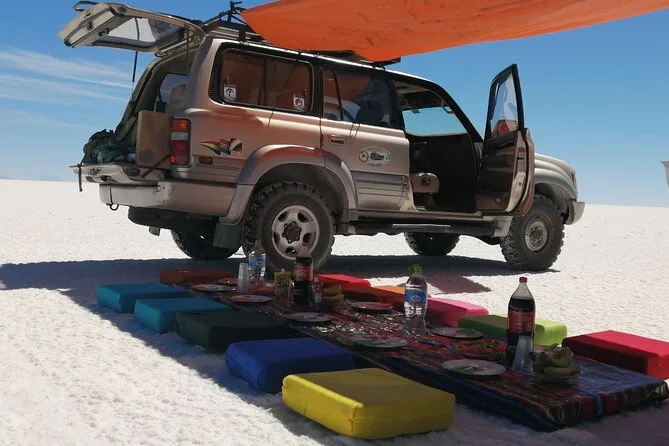 Your day includes pickup from Andes Salt Expeditions’ office in Uyuni town center; transport in a Toyota Land Cruiser 4x4; visits to Colchani village for local salt processing; entry to Incawasi Island; rain boots for walking on water during the mirror effect; an English-speaking guide; boxed lunch with drinks; vegetarian or vegan options if requested; afternoon snacks with wine at sunset before returning after dark.