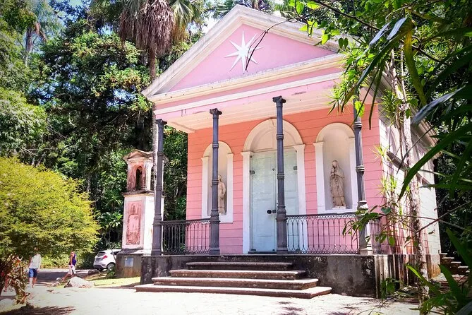 The hike itself isn’t exactly easy but not punishing either—just enough up and down to remind you you’re alive. At one point we crossed this stone bridge called Cova da Onça, mossy underfoot and slippery from last night’s rain. Felipe told us about the 19th-century coffee farms here; I kept picturing people trudging these same paths way before us. There’s something about walking on those old trails that makes you pay attention differently, you know? We stopped at Mayrink Chapel (from 1850), its pink walls faded but still stubbornly bright against all that green.