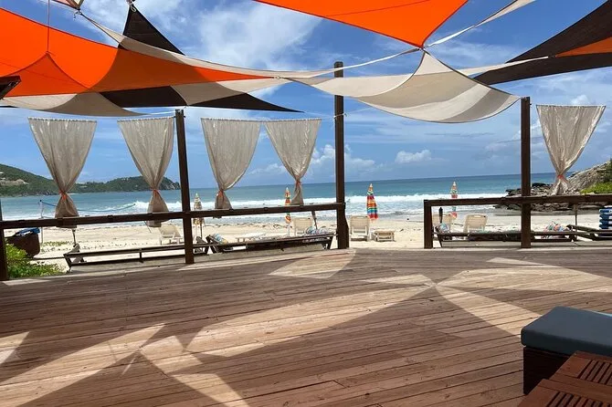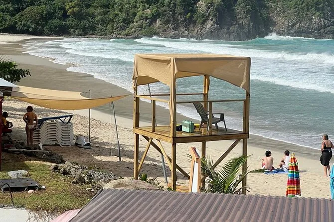Your day includes guided transport from your cruise ship pier through Tortola by open-air safari vehicle, a guided hike up Mount Alma with stories from your local guide, refreshments like lemonade plus cold towels after hiking, transfer to a peaceful white sand beach with umbrellas and chairs ready for you—and access to showers and a restaurant before heading back in time for your ship.