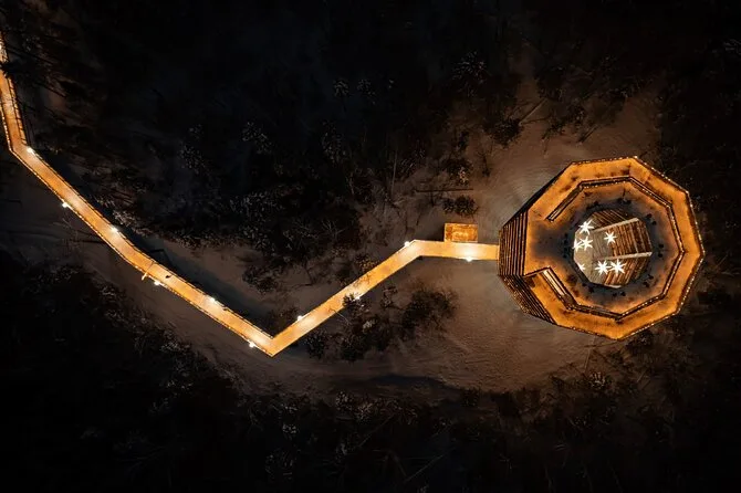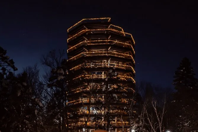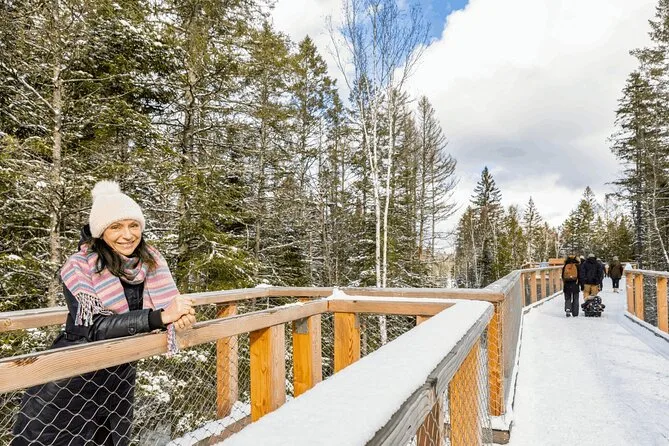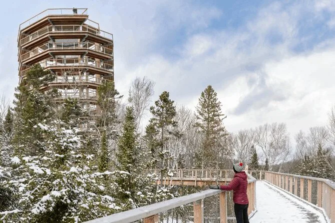 You’ll wander gently through Laurentian forests on an accessible walkway before spiraling up a 40-meter tower with sweeping mountain views. Enjoy stories from locals about the old fish hatchery and pause for food or coffee at a heritage building on site. The feeling of standing above endless green stays with you long after you head home.
