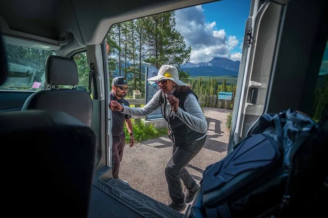 No hotel pickup; guests meet at Banff Train Station for departure and return drop-off.