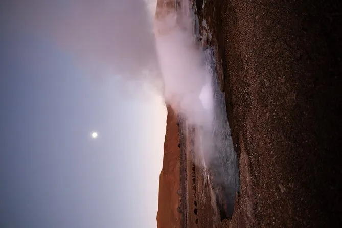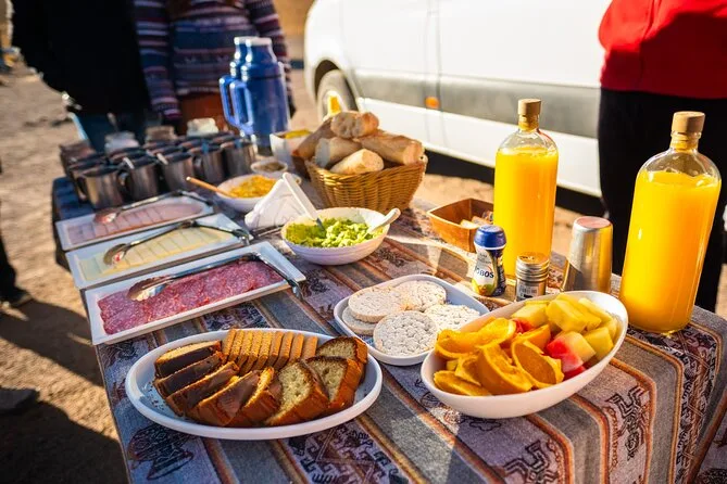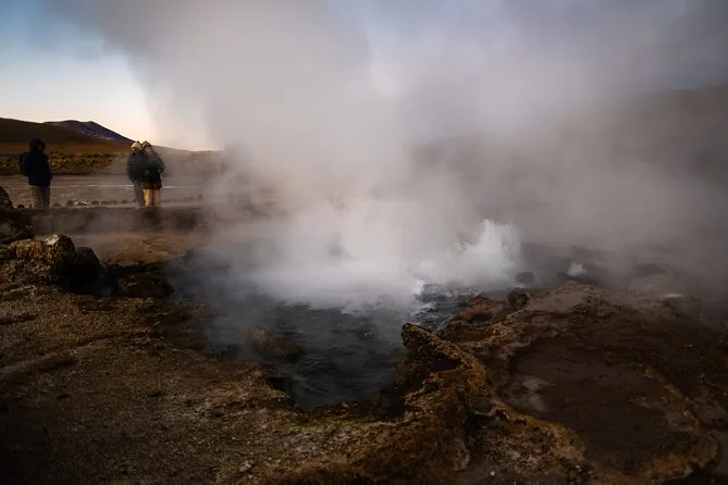 Your morning includes hotel pickup from San Pedro de Atacama before dawn, entrance to El Tatio Geysers geothermal field with plenty of time to explore alongside your guide, a full breakfast spread of bread, cheese, ham, scrambled eggs and hot drinks right by the geysers’ steam vents. Afterward you’ll pass through Putana Valley for wildlife viewing (including flamingos), plus a stop in Machuca village for local food if open before returning to your hotel.