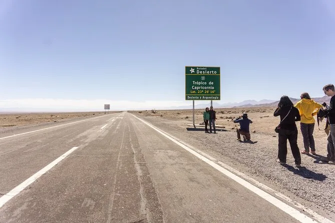 The drive out to Laguna Chaxa was quiet except for Camila humming something soft in Spanish. When we got out, it hit me — that strange mix of salt and sun in the air, sharp but clean. Flamingos moved slowly across the water, their reflections so clear it almost felt staged (it wasn’t). I tried to take a photo but gave up; you just can’t catch that kind of silence on camera. Somewhere behind us, someone laughed about how pink their legs looked next to the birds’. We stopped on the Tropic of Capricorn for a quick photo — not sure why that felt cool but it did.