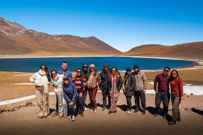 The tour lasts a full day with several stops including Chaxa Lagoon, Piedras Rojas, Miscanti & Miñiques Lagoons, Socaire, and Toconao.