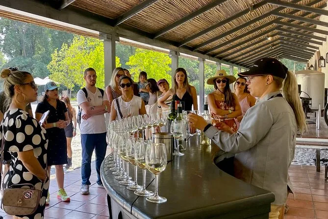The tour includes round-trip transfer from central Santiago meeting points directly to the winery in Pirque Valley.