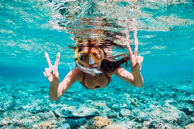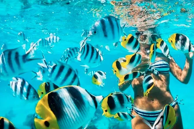 Lunch came next — fish for me, though they had chicken and veggie too. It’s not fancy but tasted fresh; I swear the lime juice made it sing a bit. If you’re on the snorkel tour like I was, there’s a 45-minute session before eating. The mask fogged up at first (classic), but once I got it sorted I spotted these wild blue-and-yellow fish near some coral chunks. Kids nearby squealed every time something brushed their legs — made me laugh because I did the same inside.