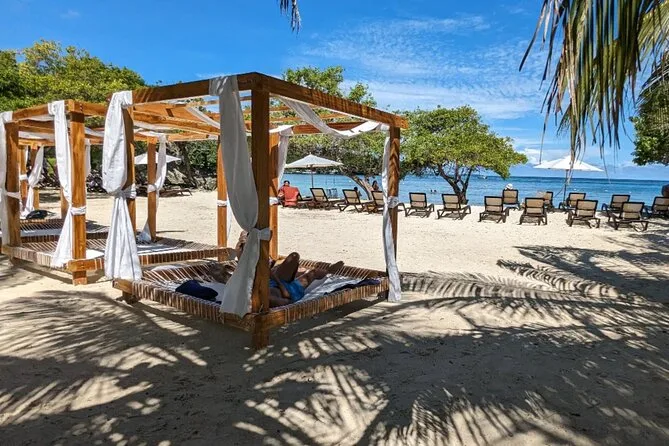 The last stop was Islabela Beach Club for us (the party folks go to Cholon Island instead — way louder). There were parasols and dance music drifting over from somewhere behind the bar, but mostly people just stretched out or tried salsa steps with one of the staff showing moves. Sun felt heavy by then; I remember sand sticking to my skin even after swimming again. Honestly, by late afternoon everyone looked sun-drunk and happy in that lazy Caribbean way.