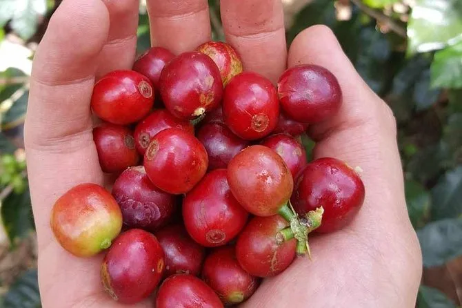 The tour includes hotel pickup/drop-off, fruit tasting at a market, entry fees for the coffee farm experience, lunch in town, transportation by air-conditioned vehicle, and health insurance.
