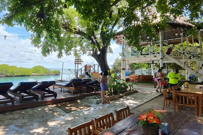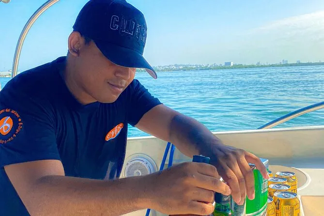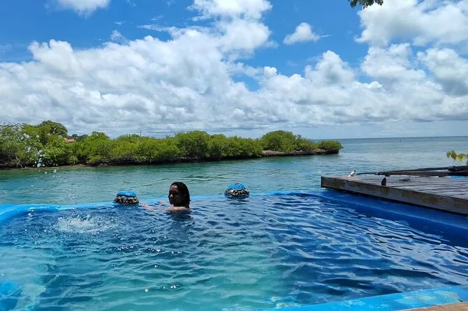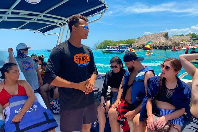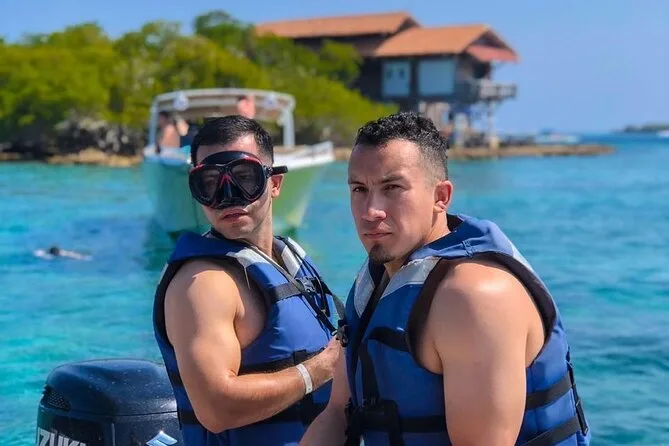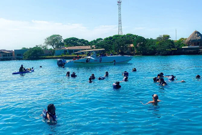 Your day includes check-in near Cartagena’s clock tower with air-conditioned transfer to the pier, open bar onboard (beer, soda & water), snorkeling mask rental for reef swims near Isla Grande or optional oceanarium visit (entry not included), lunch with chicken, fish or vegetarian choices on one island stop plus a welcome cocktail at Ibizza Island before returning late afternoon.