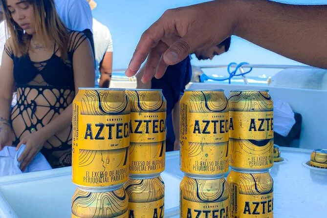 An open bar with beer, water, and soda is available onboard until stocks run out; Ibizza Island includes a welcome cocktail.