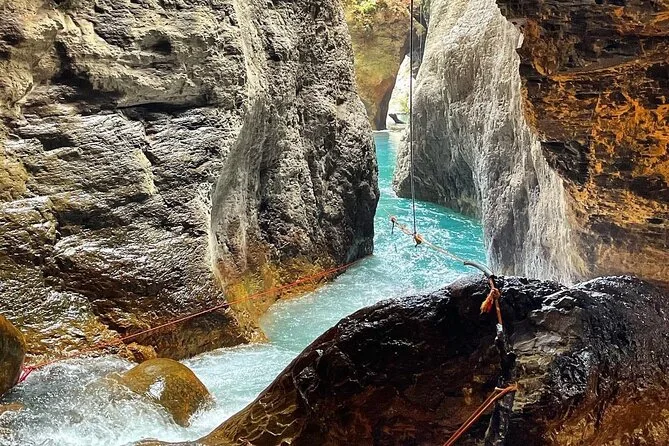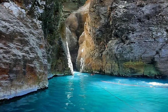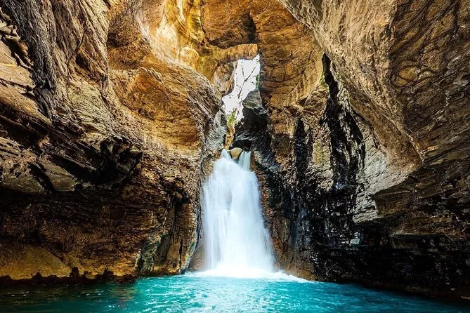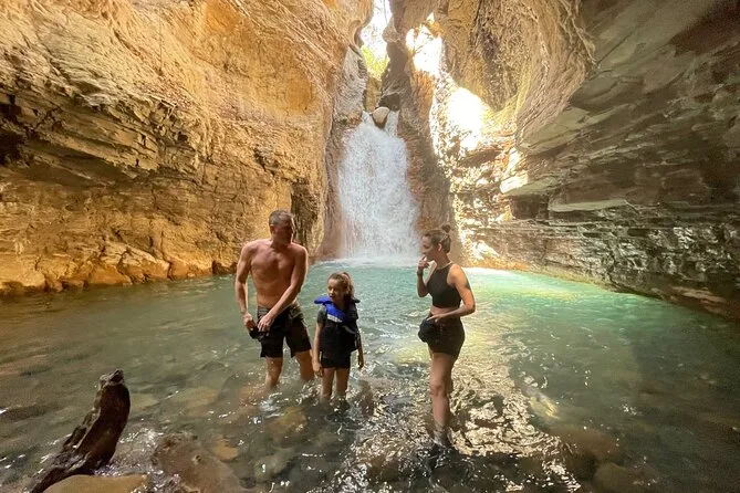 The last stretch is where you really feel it: you hear the waterfall before you see it — kind of muffled at first, then suddenly loud as you round the bend. The water is cold, but not freezing; more like a shock that wakes up every muscle. You have to swim the last bit (about 25 meters) with your shoes still on — which feels weird at first, but makes sense when you realize how slippery those rocks are. I remember looking up and seeing sunlight catch in the spray above us. Someone laughed because their hat floated away downstream. I still think about that view sometimes.