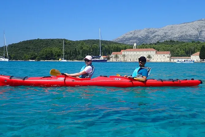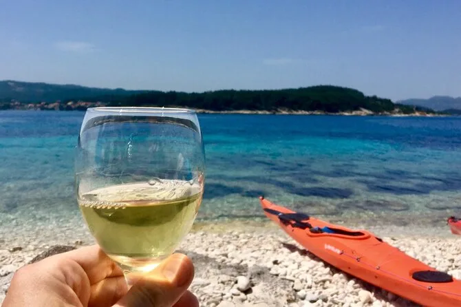 Your half-day includes all kayaking equipment (single or double kayak options), life jacket, dry bags for your stuff, plus homemade Klašun pastries and a glass of local Grk wine from Lumbarda. Kids get fresh sage juice too — all led by a local guide who adjusts pace based on your group before returning you back to Korčula or Lumbarda.
