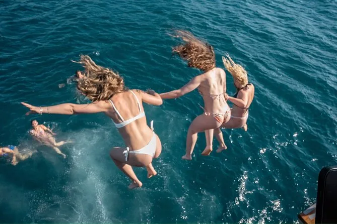 The boat party lasts approximately 6 hours including cruising and swimming stops.