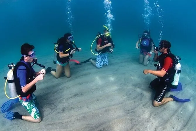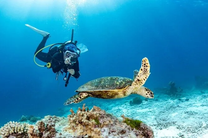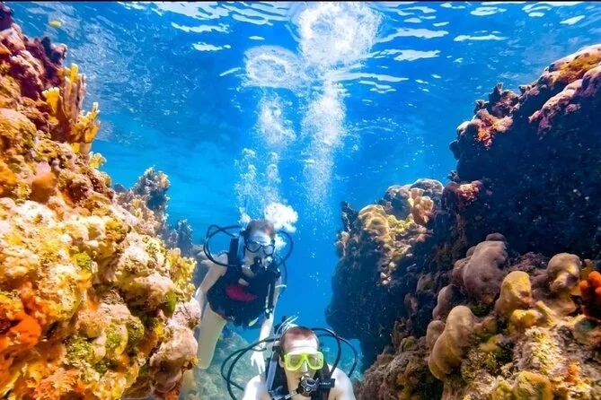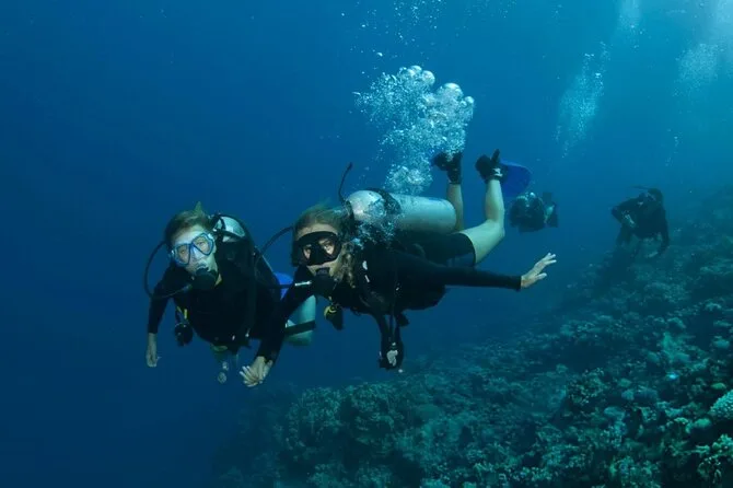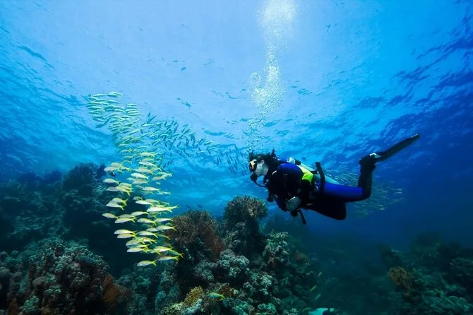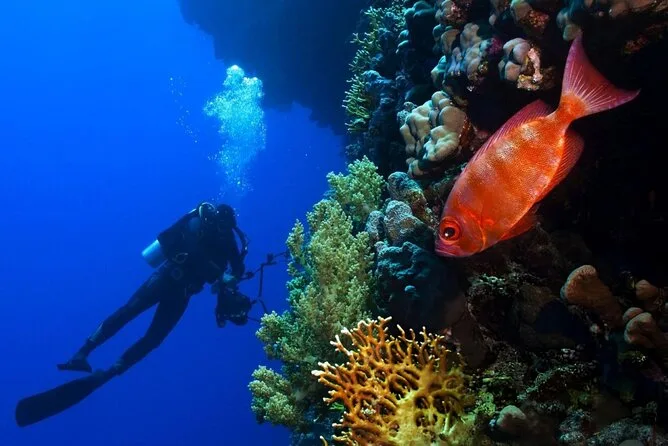 Dein Tag umfasst den Hoteltransfer in einem klimatisierten Fahrzeug in Hurghada, eine ganztägige Bootstour mit zwei geführten Tauchstopps unter Anleitung von Profis (alle Taucher- und Schnorchelausrüstungen inklusive), ein Buffet-Mittagessen an Bord sowie Kaffee, Tee, Softdrinks und Schwimmwesten – ideal zum Schnorcheln oder einfach zum Entspannen zwischen den Tauchgängen, bevor es zurück ans Ufer geht.