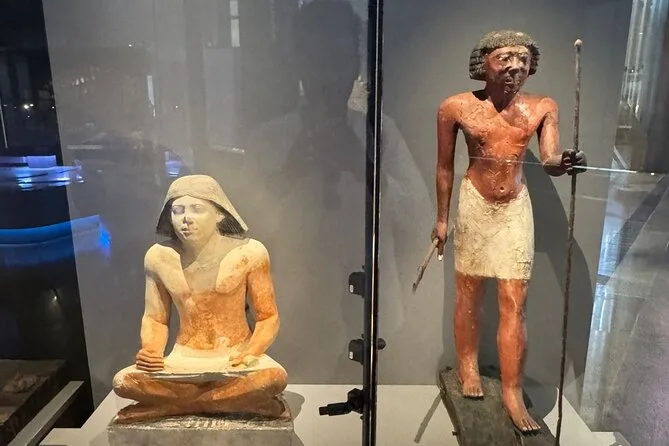 Das Grand Egyptian Museum ist riesig – ehrlich gesagt verlor ich den Überblick, wie oft wir einfach nur stehen blieben, um etwas anzuschauen. Ahmed erzählte Geschichten von Königen und Königinnen, als wären sie alte Bekannte. Zwischendurch gab er mir einen kleinen Skarabäus als Glücksbringer – den bewahre ich auf jeden Fall in meiner Tasche auf. Wir schlenderten an Statuen mit abgebrochenen Nasen vorbei und Säulen mit verblassten Hieroglyphen; immer wieder stellte jemand eine Frage, die Ahmed mit leiser Begeisterung beantwortete. Die König Tutankhamun-Galerie war voller als erwartet, aber diese goldenen Sandalen aus nächster Nähe zu sehen… da kann man sich gut vorstellen, wie das Leben damals gewesen sein muss.
