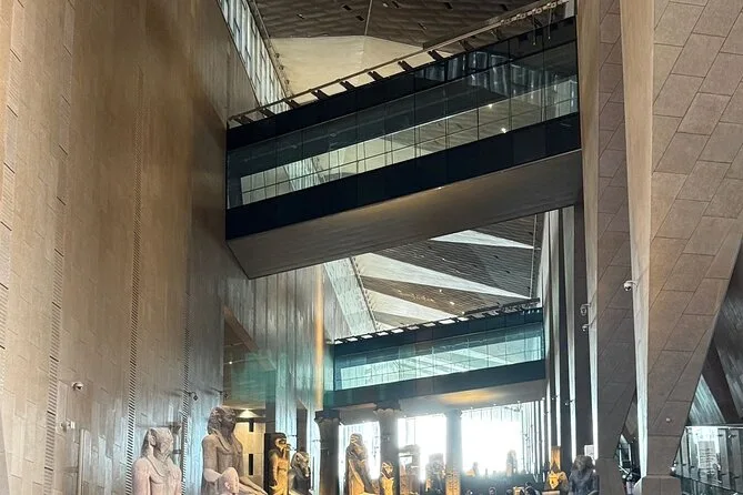 Mittagessen gab es in einem Restaurant mit Fenstern, die direkt auf die Pyramiden blickten. Ich schwöre, das Brot schmeckte allein wegen der Aussicht besser. Unser Fahrer wartete draußen, während wir aßen – er winkte uns zu, als er sah, wie wir hinausblickten. Danach kämpften wir uns durch den Verkehr Kairos (Hupen ist hier quasi eine eigene Sprache) zum Grand Egyptian Museum. Es ist riesig und überwältigend, aber unser Guide machte daraus keine trockene Führung, sondern eher einen Spaziergang durch einen Dachboden – wenn dieser Dachboden Tutanchamuns Goldmaske einfach so herumliegen hätte. Das Licht drinnen war golden, und man konnte Staubkörner sehen, die über Statuen tanzten, die älter sind als viele Länder.