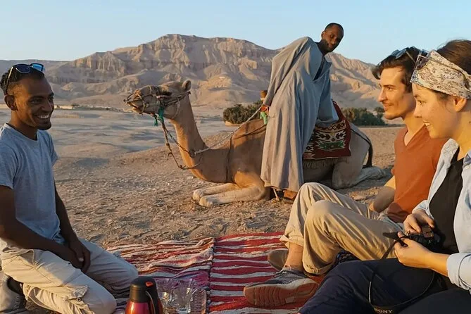 Wenn du die Sonnenuntergangstour wählst (ich habe es getan), gibt es diesen Moment, in dem alles golden und still wird, bis auf die entfernten Gebetsrufe. Wir ritten hinaus in die offene Wüste zum Tee – nur wir, Mahmoud und zwei Kamele, die gemütlich neben uns kauten. Der Tee war heiß und rauchig; ehrlich gesagt denke ich noch oft an den Ausblick über Luxor, mit dem schimmernden Nil in der Ferne. Es fühlte sich an, als würde die Zeit für einen Moment stillstehen. Mehr kann ich dazu kaum sagen.