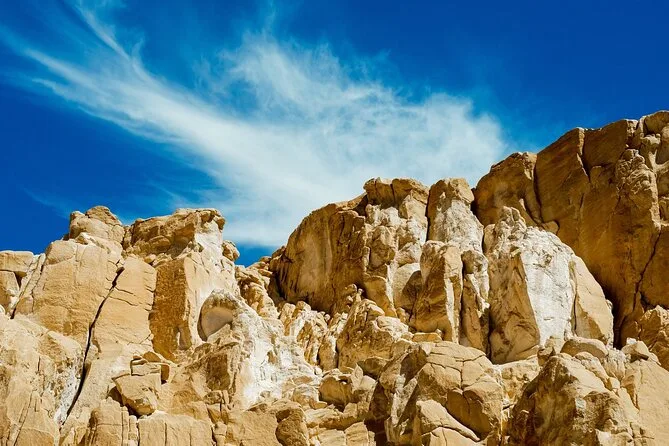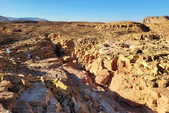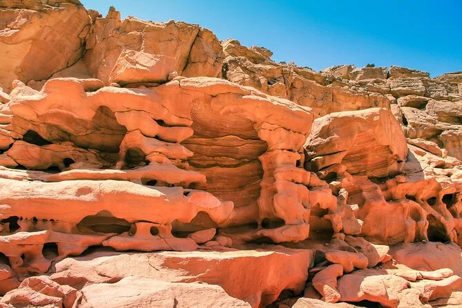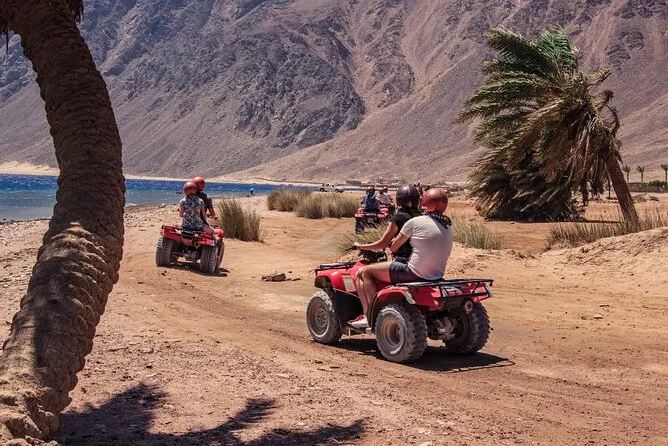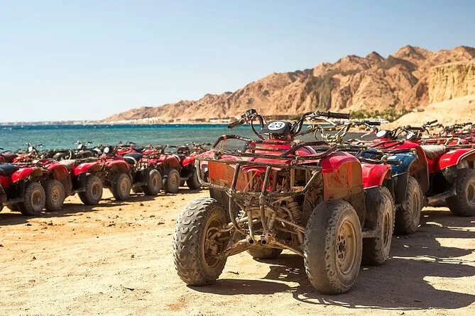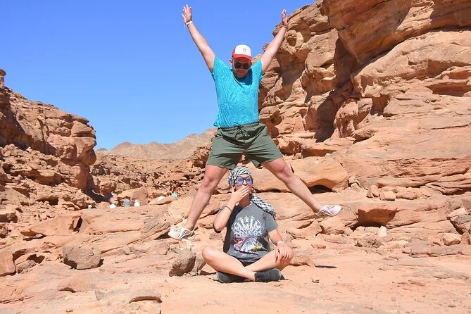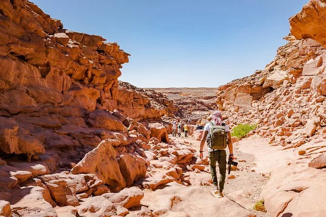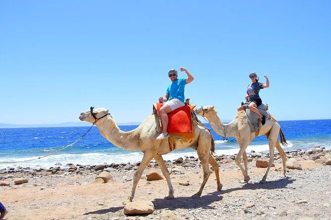Dein Tag startet mit der Abholung vom Hotel in Sharm El Sheikh in einem klimatisierten Fahrzeug, gefolgt von einer geführten Jeep-Safari durch den Salama (Colored) Canyon mit Fotostopps und Erkundung zu Fuß. Du reitest ein Kamel entlang der Dahab-Küste (Quadfahren optional), bekommst Wasserflaschen gegen die Hitze des Sinai, genießt ein Buffet-Mittagessen am Meer nahe dem Blue Hole, wo du schnorcheln oder im Camp entspannen kannst, und hast Zeit zum Einkaufen in Dahab, bevor du müde, aber glücklich zurückkehrst.