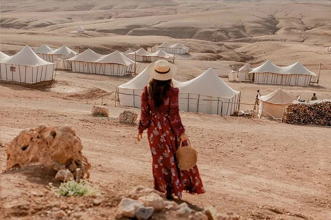 Sie entfliehen für einen Tag Marrakesch – wandern durch Berberdörfer im Atlasgebirge, teilen Tee mit Einheimischen, genießen echtes hausgemachtes Essen und reiten dann mit Kamelen durch die felsige Agafay-Wüste, bevor Sie zum Sonnenuntergang zurückkehren.