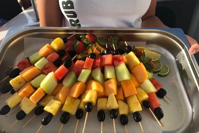 Die Crew hat dafür gesorgt, dass unsere Gläser nie leer wurden – ernsthaft, bevor du überhaupt merkst, dass du einen Drink willst, steht schon jemand mit Cocktails oder Mocktails neben dir. Das Mittagessen kam in kleinen Häppchen: gegrillte Hähnchenspieße, etwas mit Ananas (das denke ich heute noch), alles direkt an den Platz gebracht, sodass man sich nicht bewegen musste, außer man wollte sich noch ein bisschen mehr in die Sonne lehnen. Irgendwann fing jemand an, zu einem Lied mitzusingen, das ich nicht kannte – und es hat keinen gestört, dass es nicht ganz getroffen war.