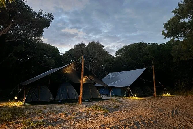 Du übernachtest zwei Nächte in festen Doppelzelten auf einem dingo-sicheren Strandcamp mit Toiletten und Duschen.