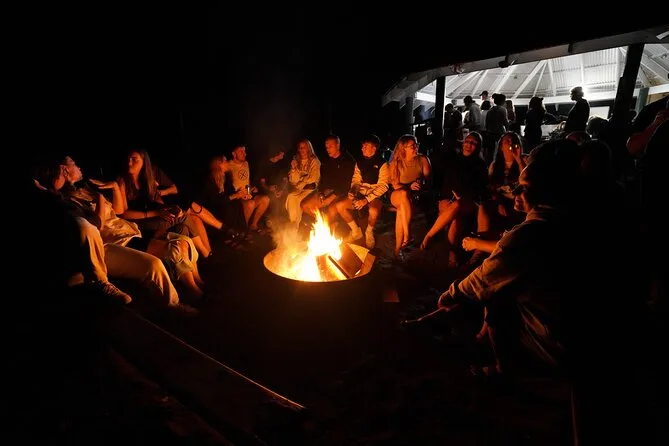 Der zweite Tag verging im Flug mit vielen Stopps: Eli Creek, wo das kalte Wasser an den Knöcheln vorbeirauschte, das rostige Wrack der Maheno, das langsam im Sand versank, und die Champagne Pools, wo die Wellen wie Sprudelwasser über die Felsen spritzten. Irgendwo dazwischen gab’s Mittagessen – ehrlich gesagt, verlor man draußen total das Zeitgefühl. Ben erzählte, wie die Maheno 1935 bei einem Zyklon an Land gespült wurde; wenn man genau hinhörte, konnte man fast die alten Motoren knarren hören. Zurück am Camp versuchte jemand Gitarre zu spielen, vergaß aber die Hälfte der Akkorde – egal, es passte einfach.