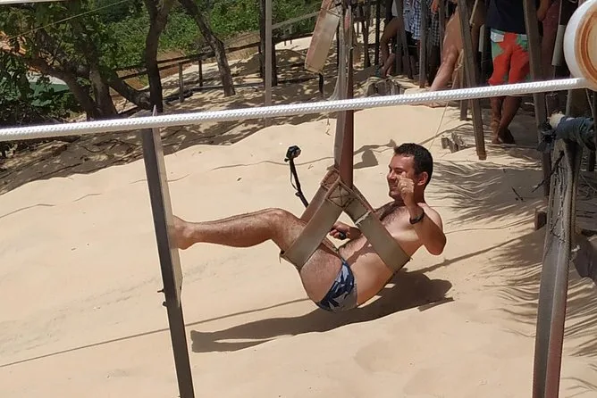 Als nächstes stand die Lagoa de Jacuma auf dem Programm. Wer Lust hat, kann hier die „aero-bunda“ ausprobieren – eine Zipline, die dich direkt in die Lagune gleiten lässt. Ein echter Adrenalinkick! Außerdem gibt es die „sky-bunda“ und eine Rutsche namens Kamikaze – Paulo forderte uns heraus, alle drei zu testen. Der Sand hier ist so fein, dass er unter den Füßen quietscht. Mittags wird die Sonne ziemlich stark, also Sonnencreme nicht vergessen.