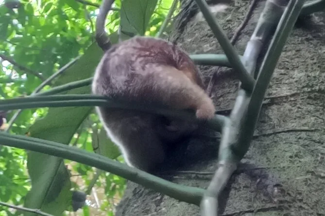Auf halber Strecke machten wir unter einem riesigen Mandelbaum nahe dem Strand Halt und genossen frische Ananasstücke. Der Sand war warm und weich – so ein Moment, in dem man einfach sitzen bleiben und den Wellen sowie den fernen Vogelrufen lauschen möchte. Auf dem Rückweg entlang des Küstenpfads entdeckten wir ein verschlafenes Faultier, das hoch oben in einem Cecropia-Baum zusammengerollt war (José fand es zuerst – wie immer). Wenn du Wildtiere liebst und kein Problem mit etwas Schweiß und Matsch hast, bringt dich diese Wanderung ganz nah an die wilde Seite Costa Ricas.