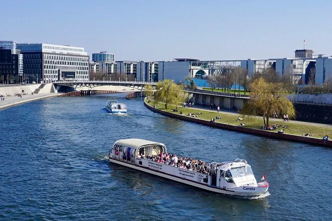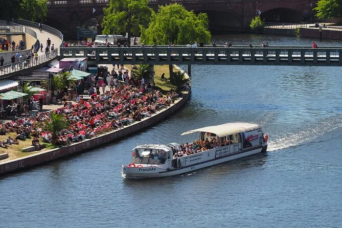 Deine einstündige Tour beinhaltet einen Live-Kommentar von einem lokalen Guide auf Deutsch oder Englisch, während du durch Berlins Innenstadt schipperst. Bei Bedarf bleibst du unter dem beheizten Glasdach trocken, kannst an Bord Kaffee oder Bier kaufen und hast Zugang zu einer Toilette.
