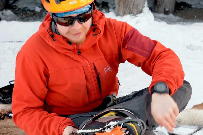 Du erhältst die komplette Ausrüstung: Helm mit Visier oder Schutzbrille, Klettergurt, Steigeisen, Eispickel und Stiefel.