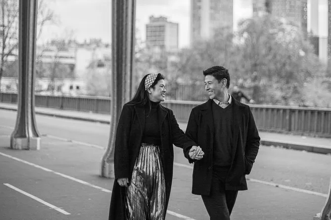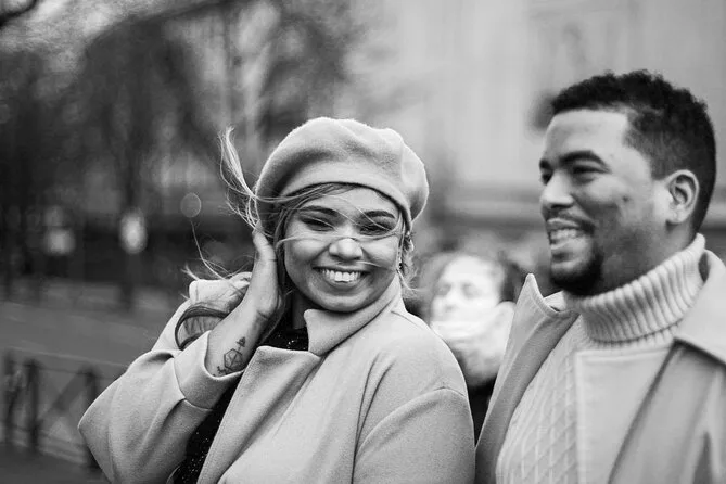 Nina hatte diese entspannte Art, uns zum Lachen zu bringen, ganz ohne Druck – mein Partner musste sogar lachen, als sie sagte: „Tut einfach so, als würdet ihr nicht frieren.“ Einmal versuchte ich, etwas auf Französisch zu sagen, und sie lächelte und korrigierte mich liebevoll (ich bin mir immer noch nicht sicher, ob ich es richtig gesagt habe). Sie führte uns durch drei oder vier verschiedene Spots und achtete immer darauf, ob ich auf den glatten Stufen mit meinen Schuhen klarkam. Andere Paare machten ebenfalls Fotos, aber irgendwie hatten wir für diese halbe Stunde unser eigenes kleines Paris-Privatkino.