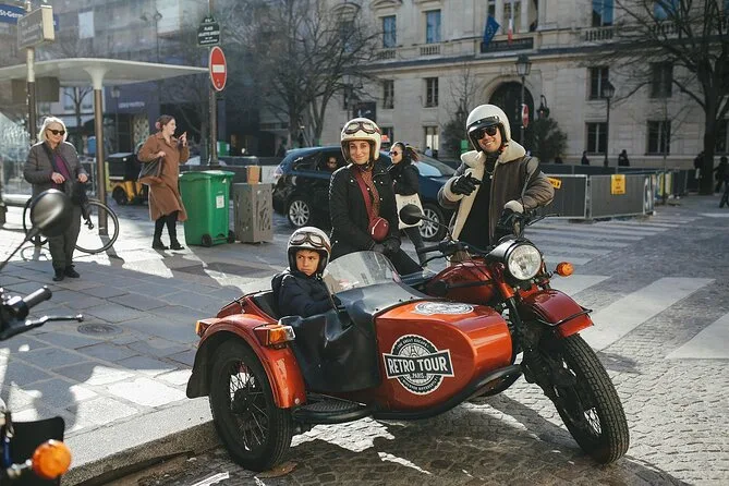 Deine Fahrt umfasst die Nutzung eines Vintage-Beiwagen-Motorrads für zwei Personen (mit Sitztauschoption), Helme sowie Handschuhe oder Schutzbrille bei Bedarf und einen professionellen lokalen Guide, der fährt und spannende Geschichten zu Highlights wie Eiffelturm und Arc de Triomphe erzählt.