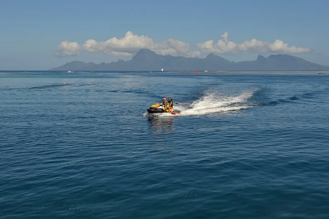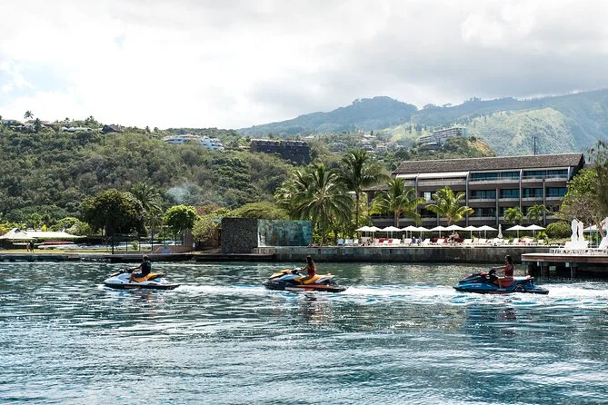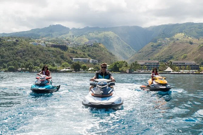 Sie sausen mit dem Jet Ski über Tahitis Lagune, mit Bergblick auf der einen und offenem Meer auf der anderen Seite. Eine Stunde voller Farben, frischer Luft und diesem unvergleichlichen Freiheitsgefühl, das man nur auf dem Wasser erlebt.