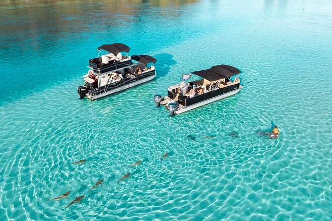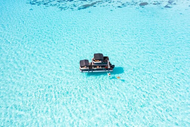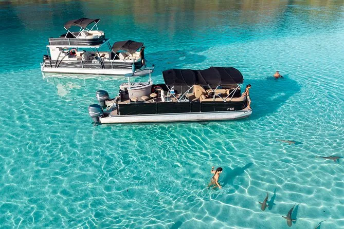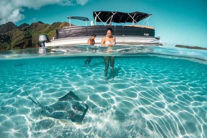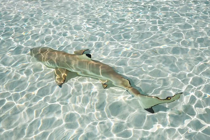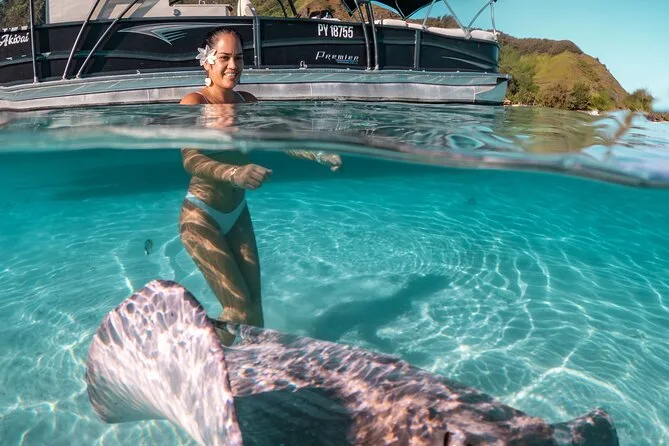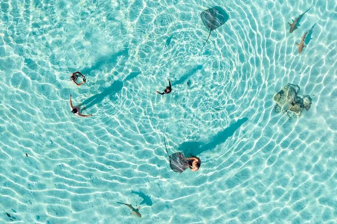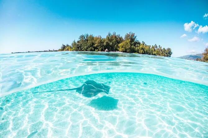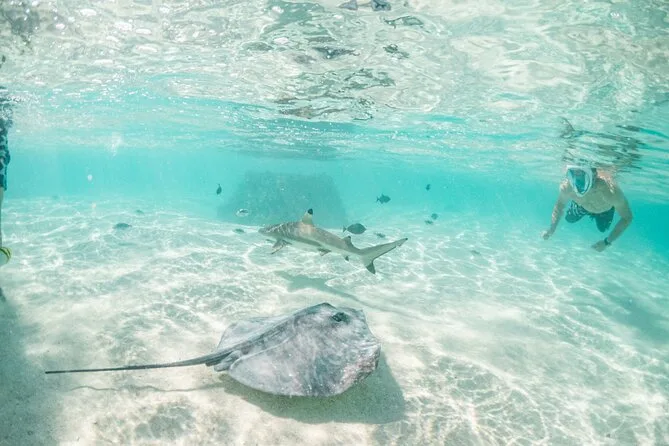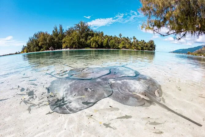 Dein Nachmittag umfasst die Nutzung von Masken und Schnorcheln zum Erkunden der Lagune mit deinem Guide; nach dem Schwimmen mit Rochen und Haien sowie dem Besuch eines Korallengartens bei den Tiahura-Motu entspannst du an Bord bei frischem Obst und kühlen Getränken, bevor es zurückgeht.
