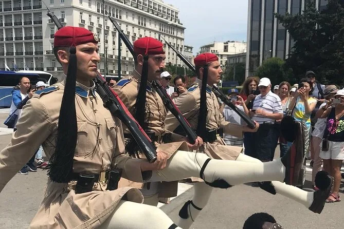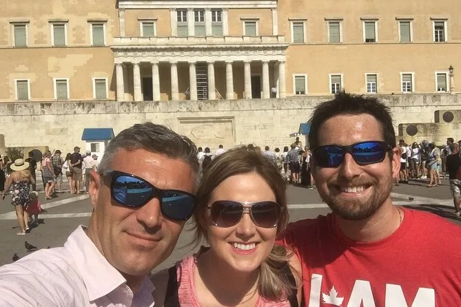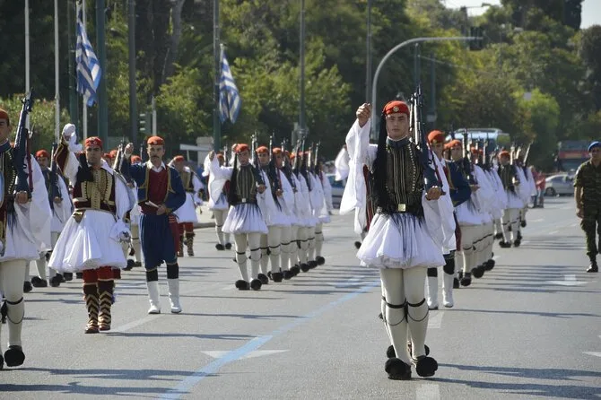 Wir schlenderten durch Athen – vorbei am Hadrianstor, dem Olympiastadion und all den prächtigen neoklassizistischen Gebäuden wie der Nationalbibliothek und der Universität. Am Syntagma-Platz sahen wir die Wachablösung am Grab des unbekannten Soldaten. Die Uniformen der Evzones wirkten fast zu perfekt, um echt zu sein; ihre langsamen Schritte ließen alle kurz verstummen. Nikos kommentierte alles aus dem Auto heraus, aber nicht wie ein typischer Reiseführer – eher wie jemand, der Familiengeschichten erzählt. Er scherzte sogar darüber, wie Athener über den Verkehr meckern, aber niemals ihre Stadt verlassen würden.