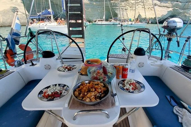 Dein Tag startet mit Frühstück an Bord, gefolgt von Mittagessen mit frischem Fisch und saisonalem Obst, unbegrenztem Bier und Wein von der offenen Bar, Nutzung der Schnorchelausrüstung für Badepausen an Orten wie Kleftiko und Firopotamos sowie spannenden Geschichten deines lokalen Guides, bevor es am Abend zurück zum Hafen geht.