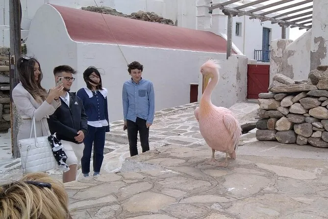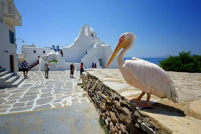 Am Platz winkt jemand aus der Ecke – es ist unsere Guide Maria, die ein kleines Schild hochhält und lächelt, als wüsste sie schon, dass wir uns in den weißen Gassen verlaufen werden. Wir schlendern durch Chora Mykonos, weichen Mopeds aus und folgen dem Duft von frisch gebackenem Brot (ehrlich, ich hätte fast noch ein zweites Frühstück eingelegt). Sie zeigt auf einen Pelikan am Hafen – Petros ist hier eine kleine Berühmtheit – ich mache schnell ein unscharfes Foto, bevor er davonwatschelt. Die Sonne reflektiert von jeder Wand; fast zu grell, aber genau richtig für diesen Ort.