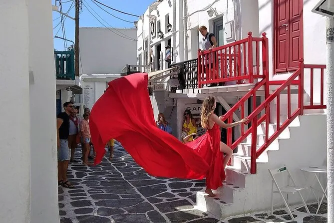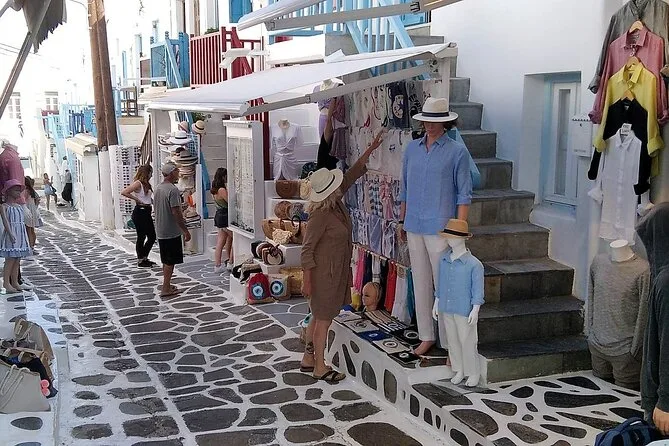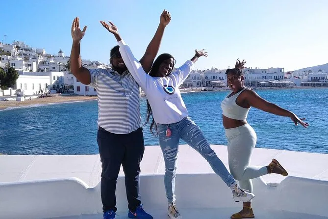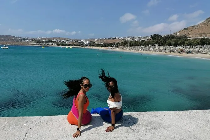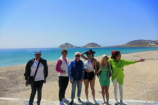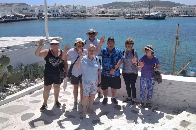 Erkunde Mykonos Stadt mit einem lokalen Guide, entdecke die berühmten Windmühlen über Klein-Venedig, schwimme am Agios Ioannis Strand und genieße Tsipouro-Snacks im Dorf Ano Mera – inklusive bequemer Abholung und Rückfahrt. Freu dich auf Lachen, Meeresbrise und unvergessliche Momente.