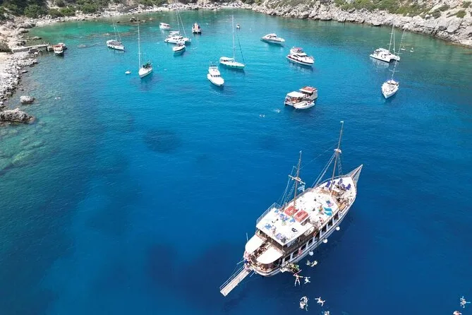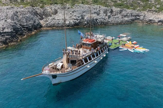 Erlebe Rhodos vom Deck eines klassischen Gulet-Boots: Stadtansichten ziehen vorbei, smaragdgrüne Schwimmstopps in der Anthony Quinn Bay, Spaß auf den schwimmenden Spielgeräten von Fun Island und ehrliches griechisches Essen mit neuen Freunden. Jeder Halt hat seinen eigenen Charme – mal lebhaft, mal ruhig – und alles eingebettet in diesen entspannten Inselrhythmus, den man nicht mehr loslassen will.