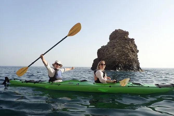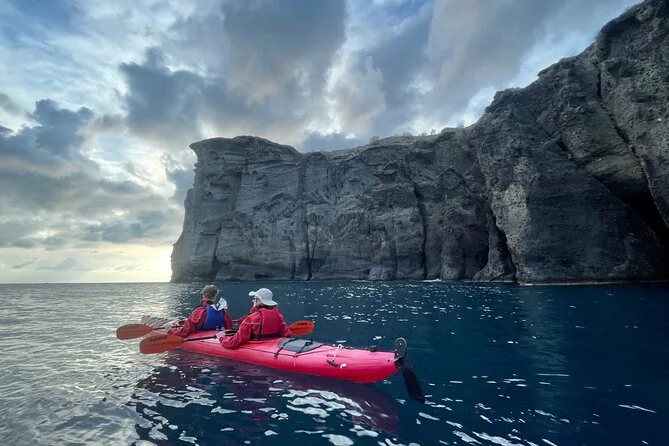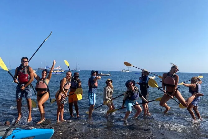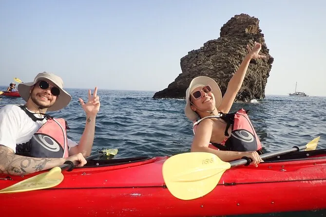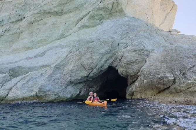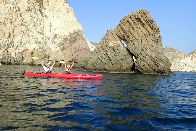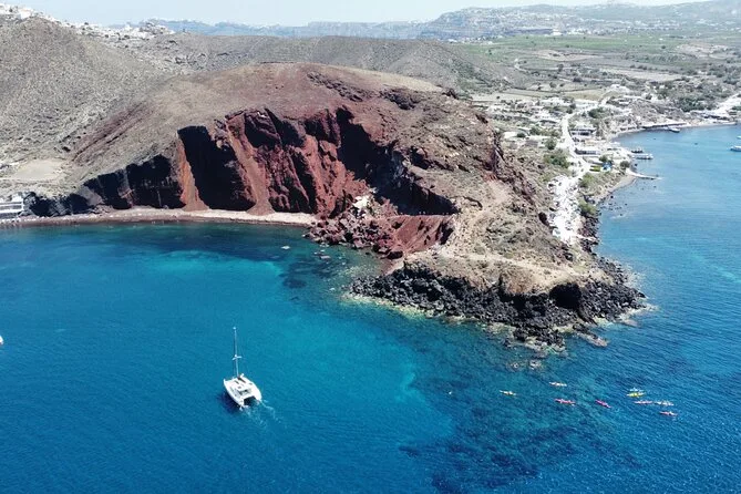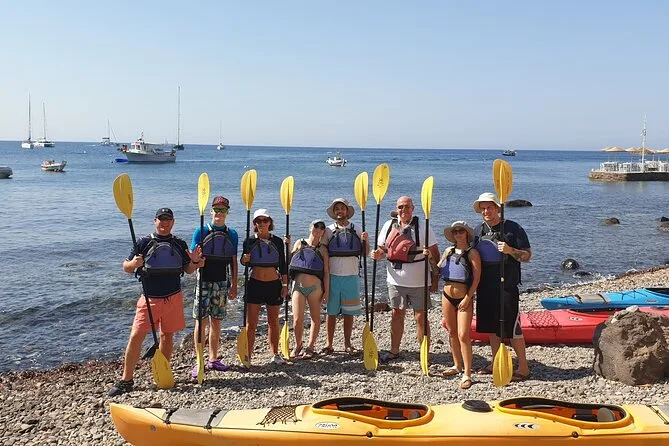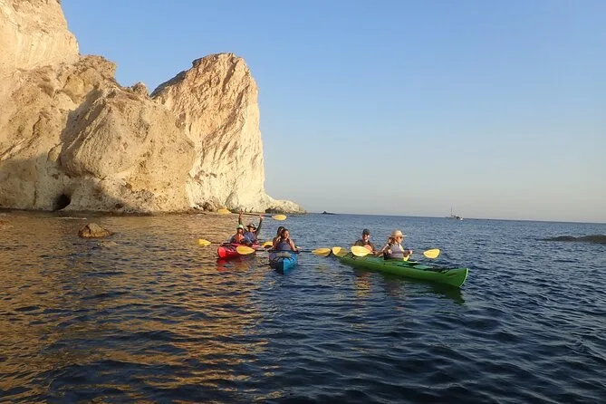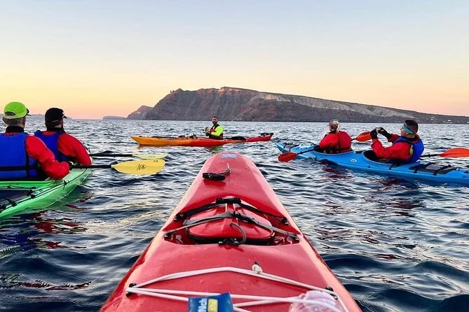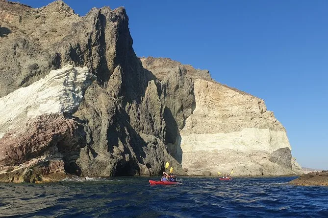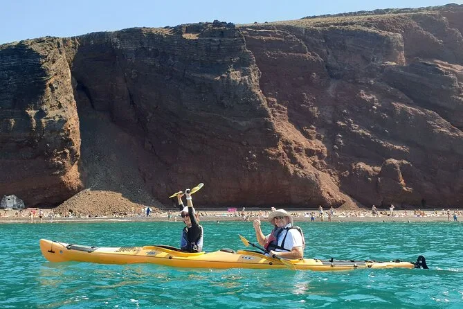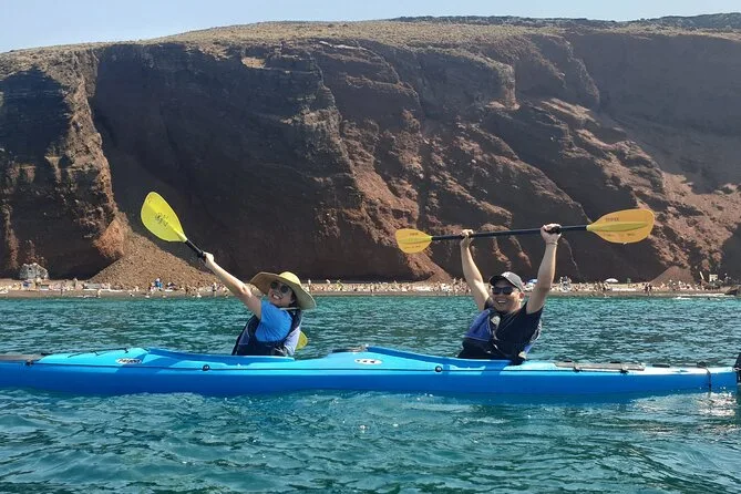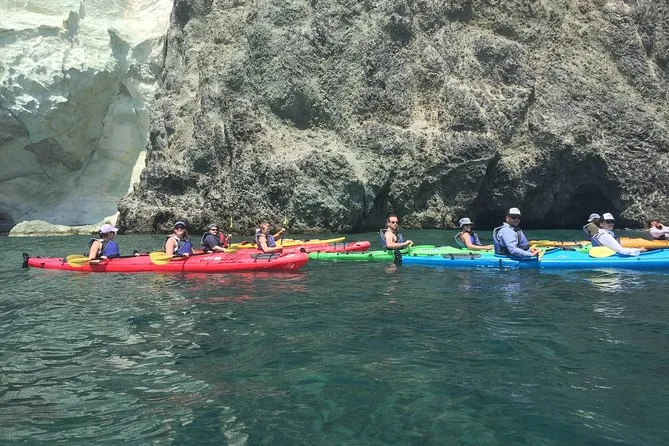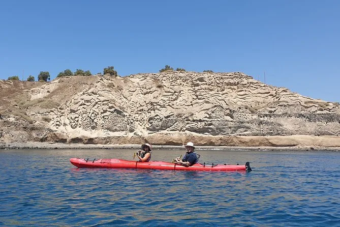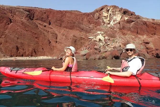 Erlebe Santorinis wilde Südküste per Kajak in kleiner Gruppe mit lokalem Guide, schwimme und schnorchle an Rotem und Weißem Strand. Entdecke versteckte Meereshöhlen und genieße ein hausgemachtes Picknick auf den Steinen. Lachen, salzige Luft und unvergessliche Momente inklusive.