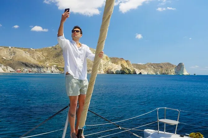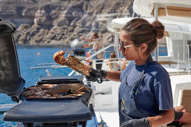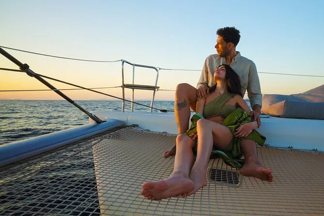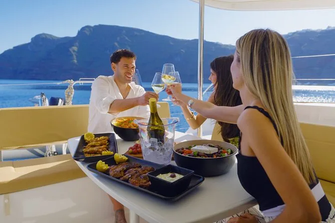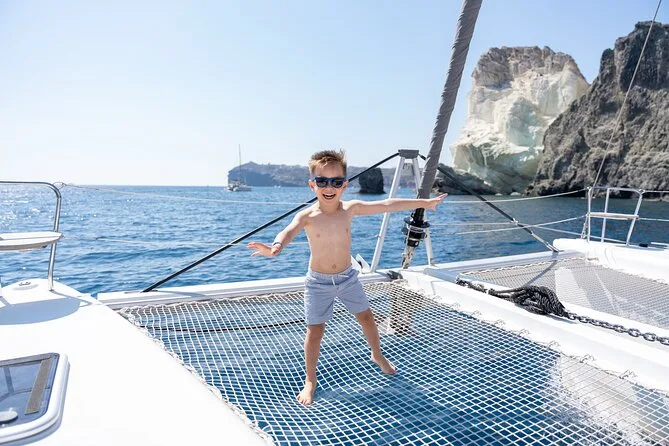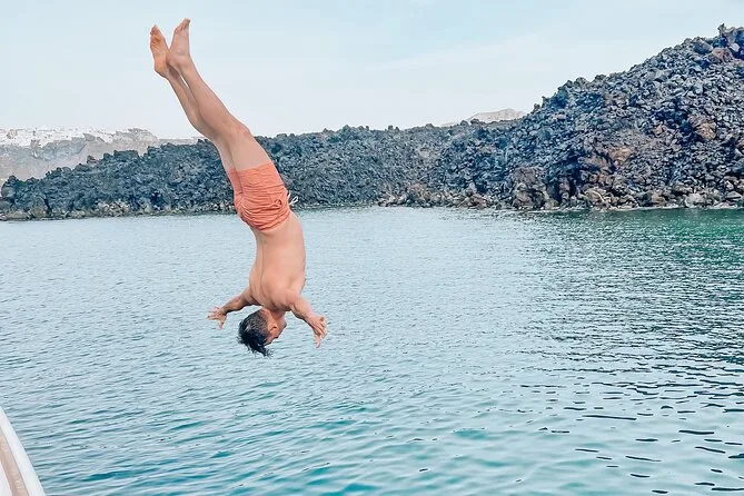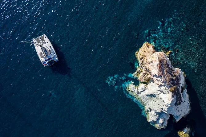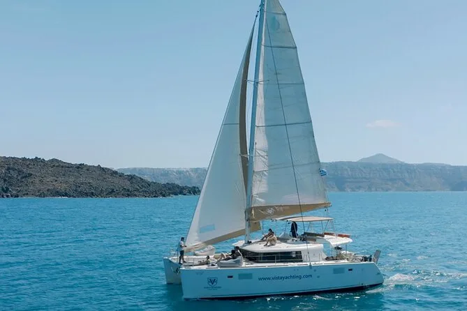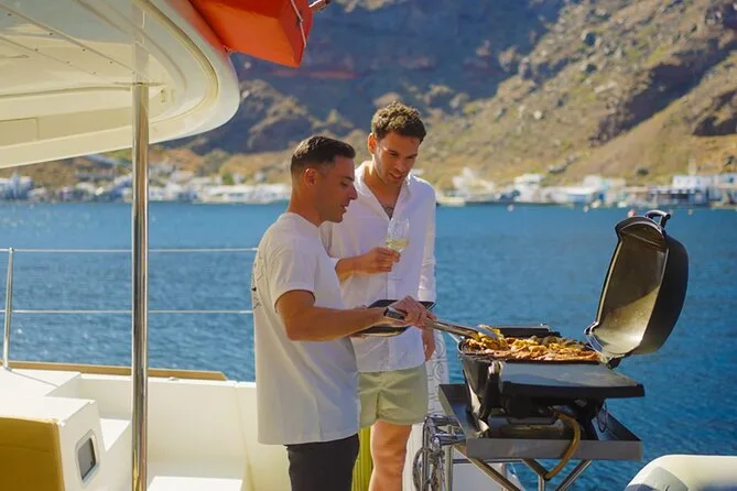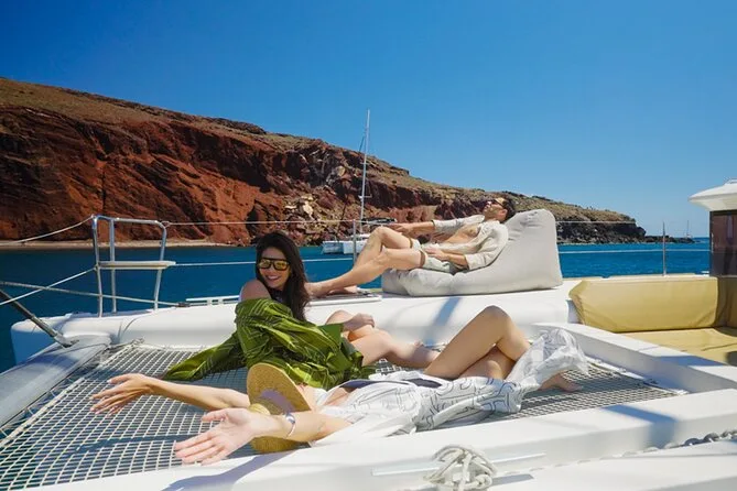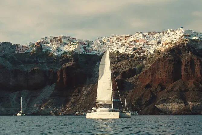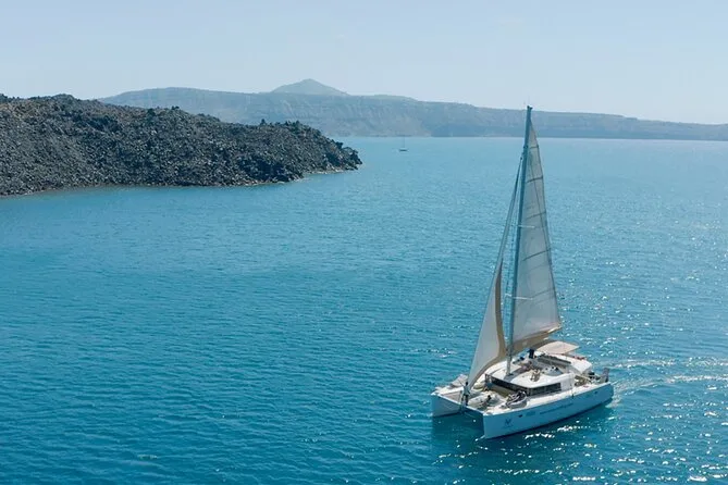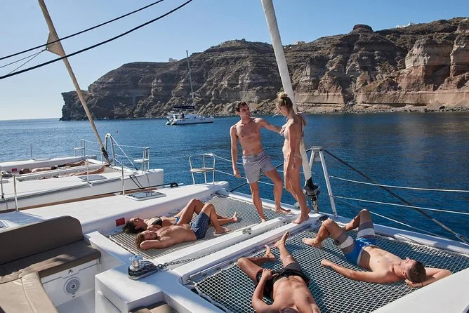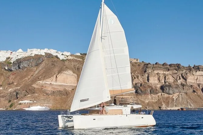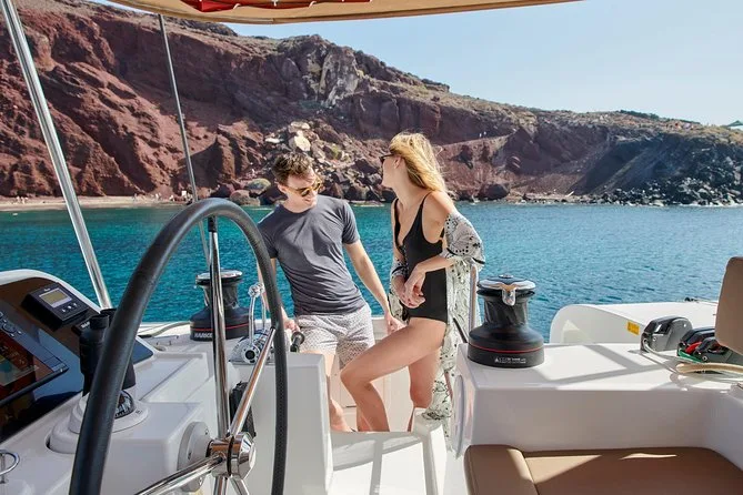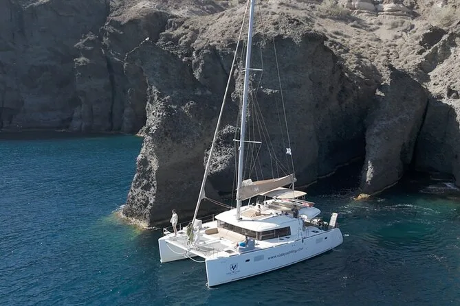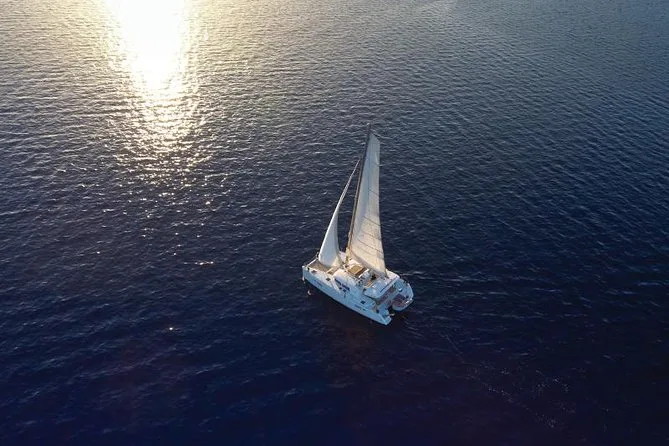 Erkunde Santorinis Küste mit dem Katamaran, schwimme an Red Beach und White Beach, genieße Vulkanquellen und ein frisches BBQ an Bord mit offener Bar. Lokale Guides erzählen Geschichten und sorgen für gute Stimmung. Der Sonnenuntergang über Thirasia macht den Tag unvergesslich.