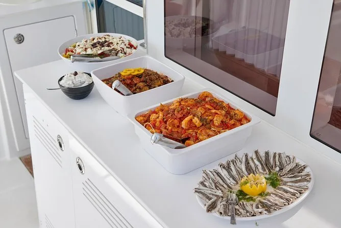 Dein Tag startet mit der Abholung von deiner Unterkunft auf Santorini und dem Einstieg in einen modernen Katamaran. Alle Snacks und das komplette BBQ werden frisch an Bord zubereitet – denk an Meeresfrüchte-Pasta und griechische Salate – dazu gibt es unbegrenzt Getränke von der offenen Bar. Handtücher und Schnorchelausrüstung stellt die Crew, damit du zwischen den Schwimmstopps an Red Beach, White Beach, den Vulkanquellen beim Leuchtturm von Akrotiri und der Insel Thirasia einfach entspannen kannst. Zurück geht es bei Sonnenuntergang mit Blick auf die Caldera.